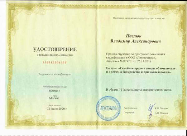 Адвокат Павлюк Владимир Александрович прошел курсы обучение по программе повышения квалификации по теме Семейное право в спорах об имуществе и о детях, в банкротстве и при наследовании